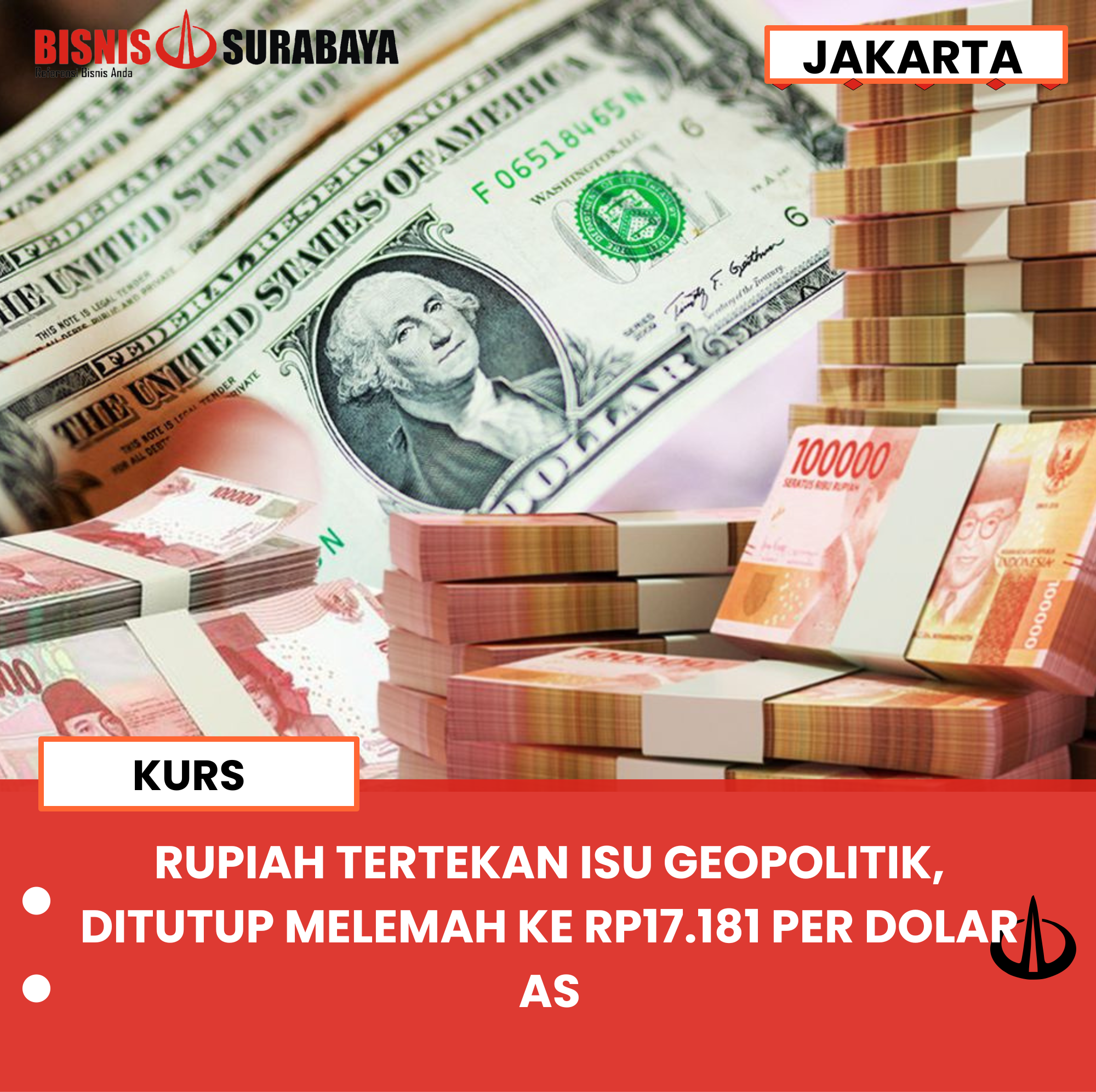 RUPIAH TERTEKAN ISU GEOPOLITIK, DITUTUP MELEMAH KE RP17.181 PER DOLAR AS